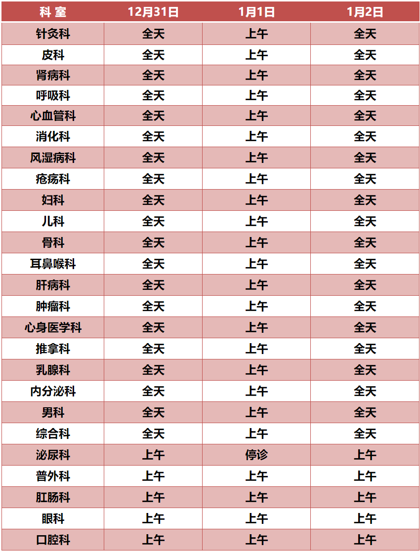 12月31日至1月2日:上午半日,开放时间上午08:00-12:00(11:30停止取号)