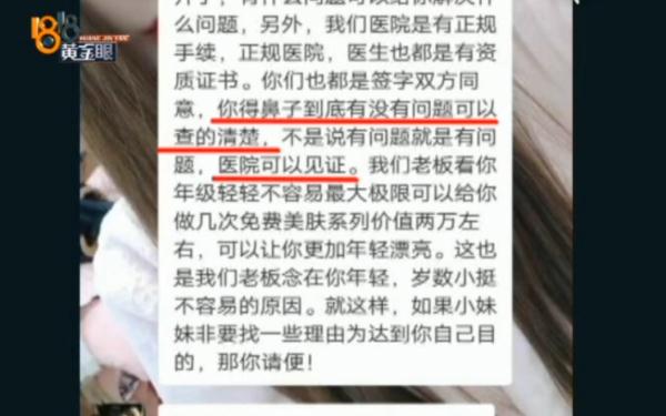 女孩说:“自己的鼻子也闻不到了,就像被堵到了一样,去医院检查的话说是鼻炎”。女孩觉得鼻子闻不到味道也是和整形有关的,希望能退款。