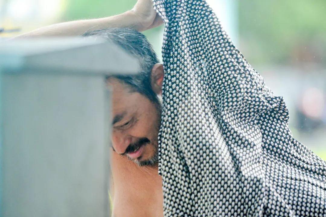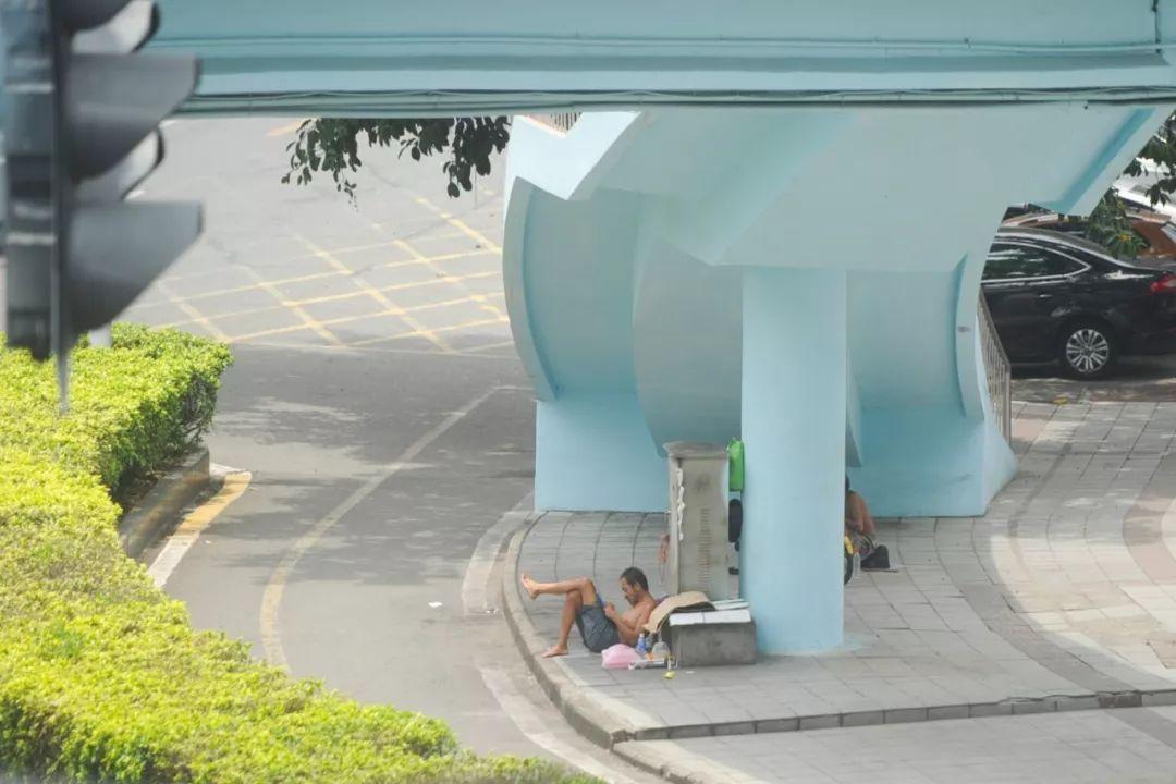 陈颖没有短袖,光着膀子,胡子长满腮角和嘴唇。夏日的东莞时热时雨,在太阳毒辣的时候,他用纸箱盖住身体遮阳,在大风夹杂着雨水来袭时,他则拿一块塑料布将自己完全包裹起来。