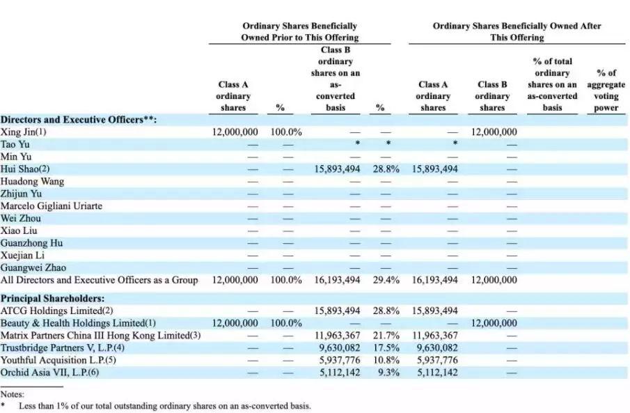 招股书显示,新氧董事邵晖持有公司28.8%的股份,不过,招股书同时也宣布,邵晖辞去公司董事职位,据悉,邵晖是公司的天使投资人,后来又追投了C轮,所以股份比较多,但并未参与过公司管理。据招股书,新氧董事长、CEO金星拥有1200万股A类普通股,此次发行后,金星的A类普通股将转换为B类普通股,拥有超过50%的投票权。