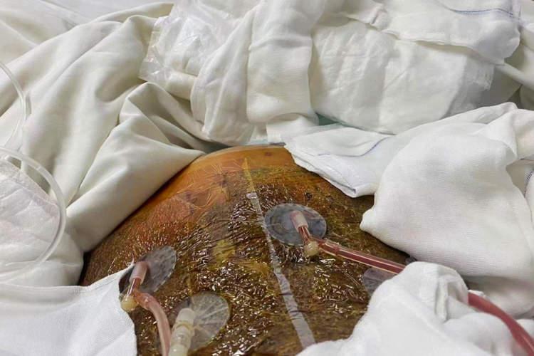 由于家人无法进入ICU病房探望,吴先生特地拜托医生拍了一些丈母娘伤口的照片,这才看到,秦阿姨整个腰腹一圈的皮肤都被去除,露出里面红色的血肉,肠胃的位置还插着2根管子,以此排出排泄物,而在腰腹周围,则有部分皮肤呈现出黑紫色,以及的褶皱。