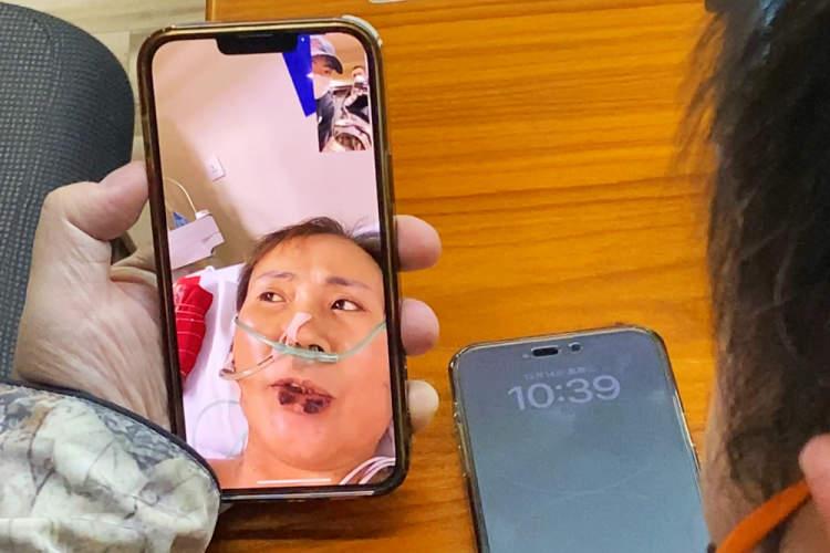 震轩美发店员介绍给“微加医美”12月14日,通过吴先生的手机,记者与秦阿姨通上了视频电话。画面中的秦阿姨躺在病床上,面色蜡黄,鼻子插着输氧管,下嘴唇还粘着血痂,因为几次手术下来使用了许多麻药,秦阿姨说话时显得有气无力,只能断断续续地交流。