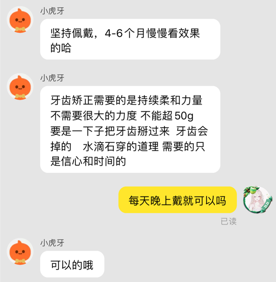 “用一个晚上起来,早上感觉是有点变化了。”“戴上睡觉,第二天有酸酸的感觉,应该在矫正了”。
