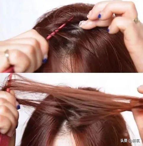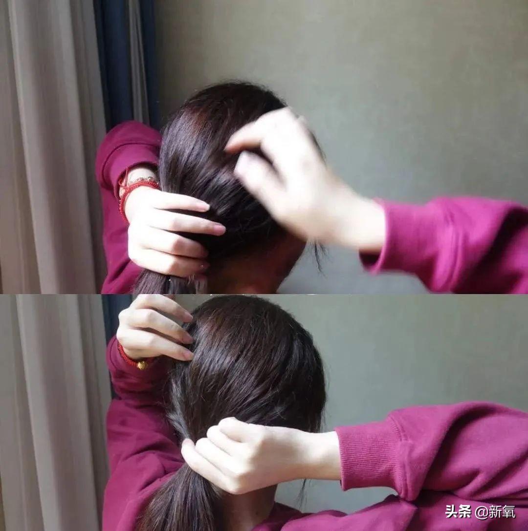 STEP3.然后就可以扎头发了,表面用手弄齐,不要把手戳到头发里面。如果担心不蓬松,可以再抽一些头发出来。