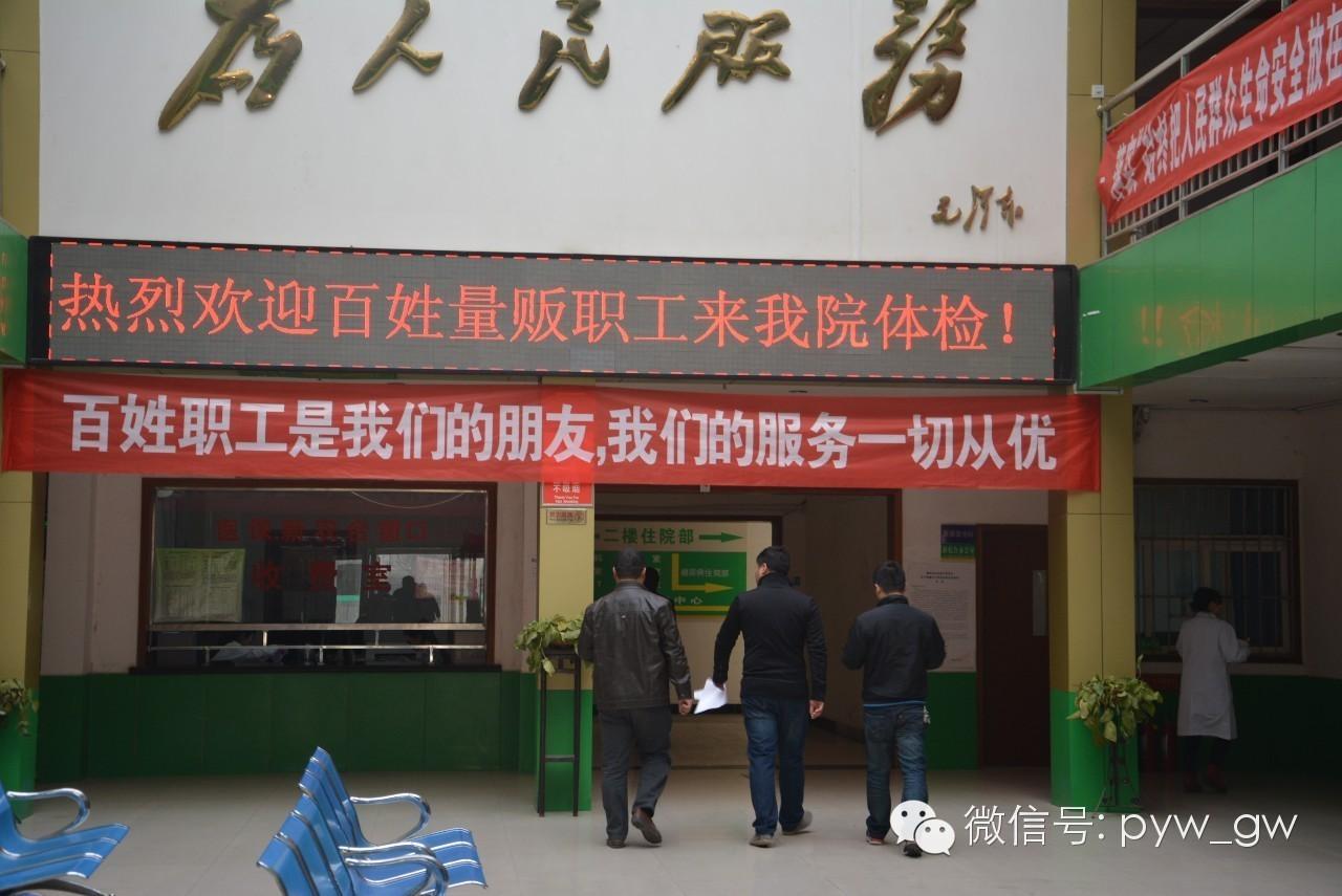 给近千名员工检查的内容为内科、外科、妇科、五官科、血常规、尿常规、血脂血糖、肝功及五项、心电图、彩超、女性宫颈癌筛查等项目。为体检和经营工作正常进行,公司办公室同院方精心安排了分批体检的时间,规范了体检流程,做到了工作、体检两不误。这不,在金桥医院彩超、心电图、胸透等各个科室里,我们看到一个个百姓家人喜笑颜开的表情,你一言我一语分享着这次体检的心得感受,抒发着对百姓的感恩情怀。