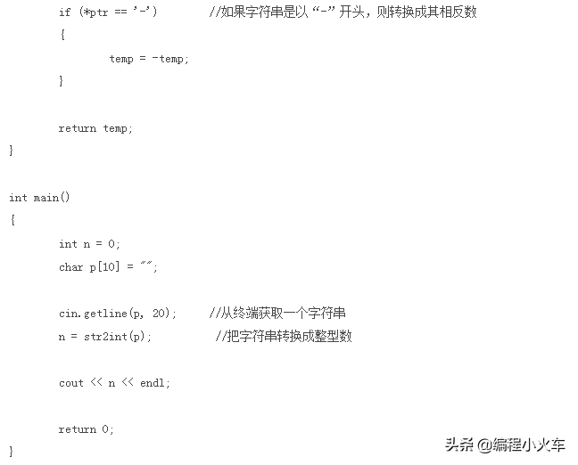 程序中的str2int函数作用是将字符串转换成整数。这个函数的转换过程与例题2中的int2str函数相比更加简单,它只需要做一次while循环(代码第13行)就能把数值大小计算出来,如果结果是负数,就加一个负号。