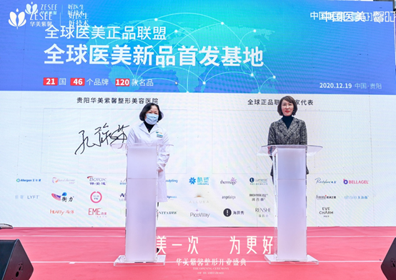 美国艾尔建美学战略客户部全国总监王宏女士作为厂家代表致辞,对贵阳华美紫馨开业表示热烈祝贺,并坚定响应--华美紫馨联盟的责任医美号召,坚决履行高端医美服务者的职责,始终选择华美紫馨新品基地。