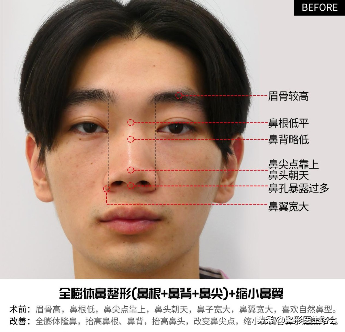 我们做鼻子不能只看鼻子,还要考虑面部五官比例。小伙子的眉骨是比较高的,需要考虑鼻子与眉骨的协调性;小伙子鼻翼比较宽,超过了两眼间距。另外,鼻根、鼻背都比较低,鼻尖表现点有些靠上,鼻头朝天,鼻孔暴露过多。所以,这些问题都是需要改良,同时还要考虑小伙子的鼻部皮肤张力等,再设计方案。