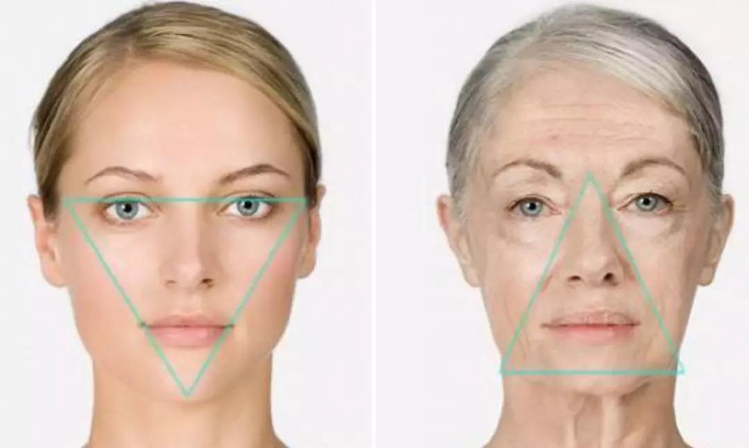 成熟期和衰老期相比,面部轮廓会由一个倒三角形变成正三角形。
