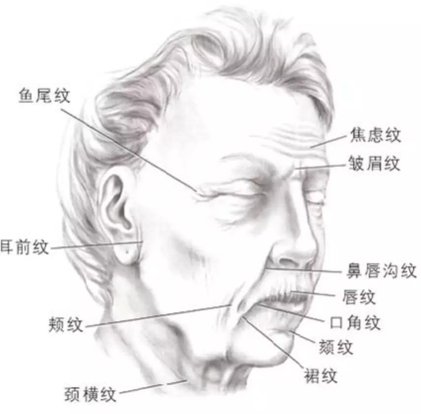 除了法令纹,随着衰老还会出现鱼尾纹、眉间纹、川字纹、抬头纹、颈纹等等…如果要细细数的话,大概有20多种。