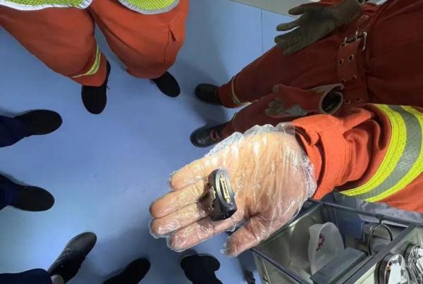 据家中老人介绍,玩具手枪是金属制成的,小孩玩耍时发现有东西落在里面,想用手扣出来,结果被卡住了。