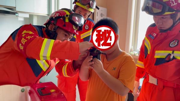 随即消防员双手握住玩具枪两端,反向用力往外拉扯,几次尝试后成功将男孩手指抽出。