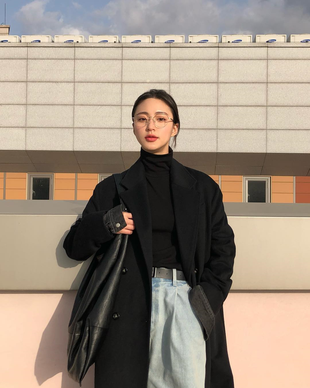 宽松版型黑色毛呢外套搭配蓝色牛仔裤