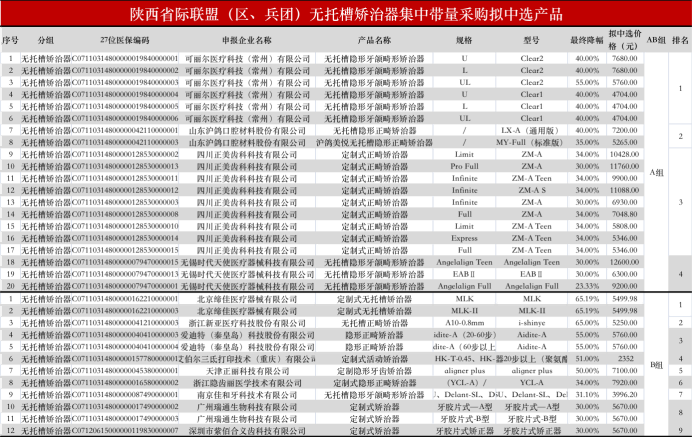 在进入A组的无托槽矫治器产品中,仅有时代天使的Angelalign Full降幅低于30%,而市占率仅居其后的隐适美,则未出现在拟中选名单中。