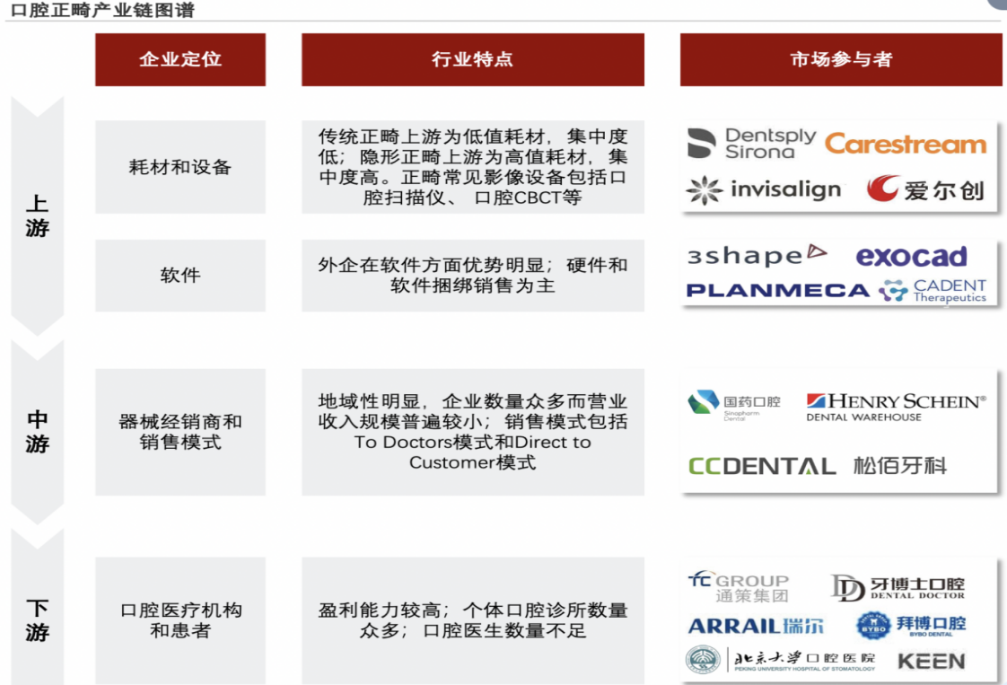 上游耗材和设备主要依赖进口,但国产化率正在提升;中游器械经销商企业数量众多且营收规模偏小;下游口腔医疗机构直接面向正畸消费者终端,盈利能力较高,但口腔诊所数量多、良莠不齐,且口腔医生数量不足。