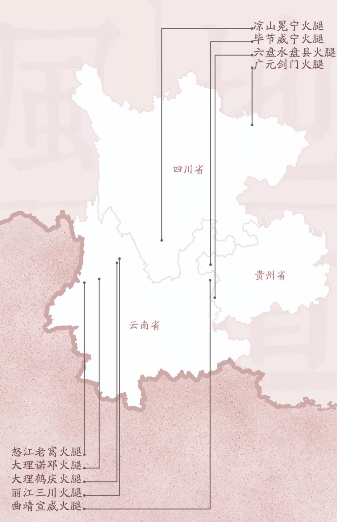 滇中要提名禄劝撒坝火腿,滇中偏西出楚雄火腿。还有一些偏远山区也有,如哀牢山猪火腿和无量山火腿