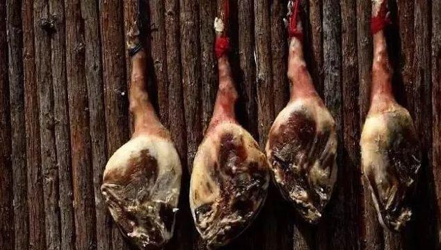▲ 晾晒的威宁火腿,一只标准的“琵琶腿”。图/网络