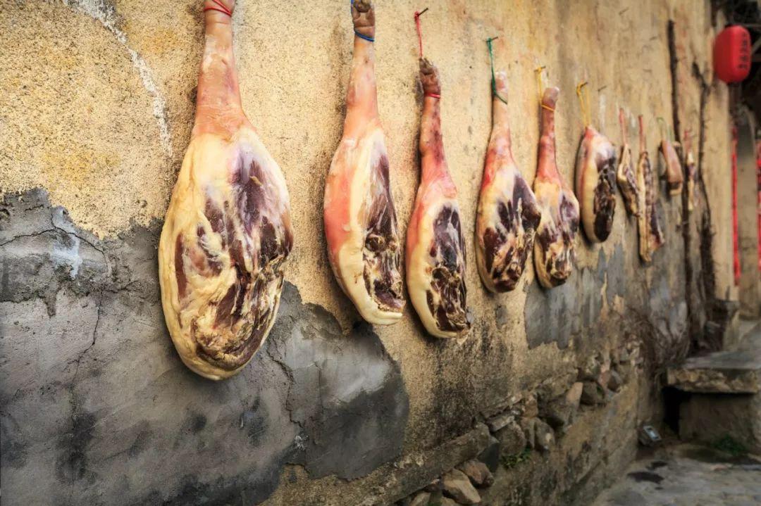 至今,皖南徽州当地村民仍有晾晒火腿的传统,将猪腿晾晒在房前屋后,鲜艳的肉色,独特的芳香,剔透的油光,是冬春里别致的风景。