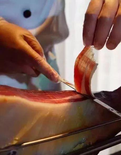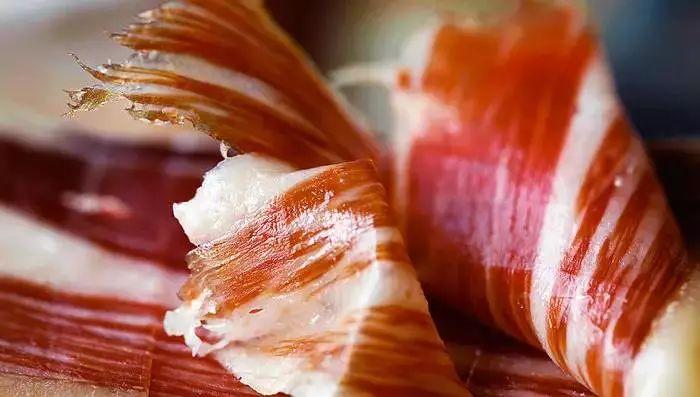 切开后的火腿如一件精美的针织艺术品白玉般透亮的脂肪穿梭在鲜红与玫红的瘦肉。一年的火腿闻起来清香扑鼻,两年以上的则浓郁撩人,入菜、生吃都口味。