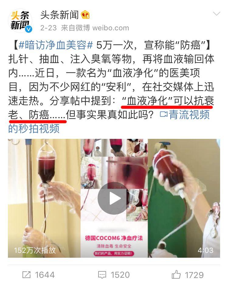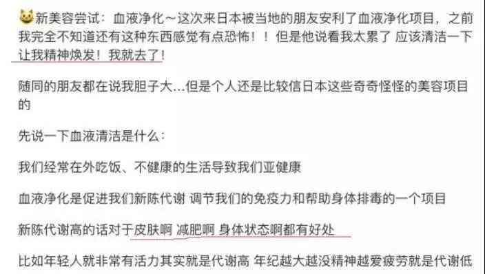能看出来,鼓起勇气去尝试的她是真的相信“洗血”带来的各种好处。她并非孤例,网红夏某也在微博上晒过自己“洗血”的照片。