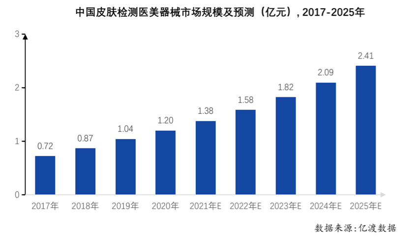 另一台VISIA皮肤检测仪也吸引观众纷纷打卡,“它运用光学成像功能,即时分析表皮的斑点、毛孔、皱纹和红血丝,可以直观反映皮肤潜在的深层问题,是医生开展进一步诊疗的重要参考。”近年来,随着皮肤美容、微创注射等轻医美项目进一步普及,皮肤检测器械作为医美诊疗流程前端的设备,市场规模增势,预计2025年将达2.4亿元。