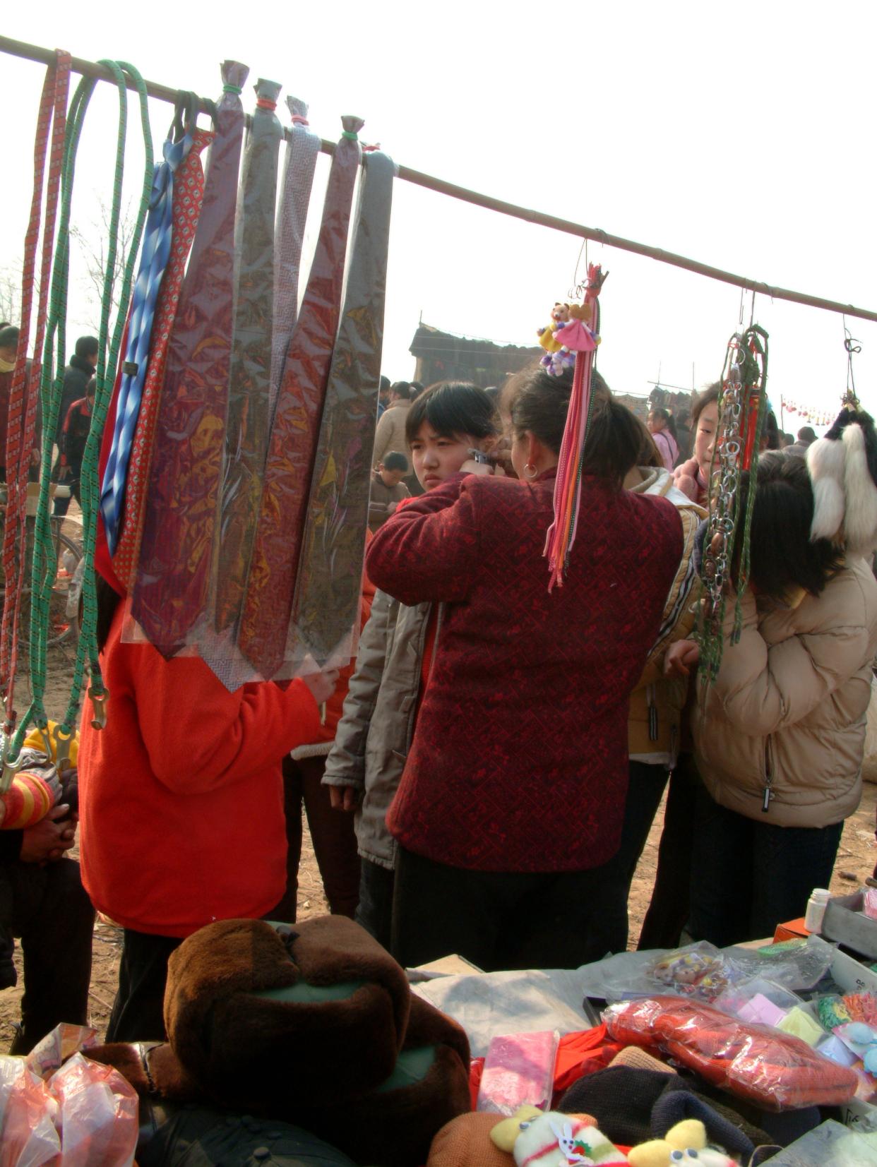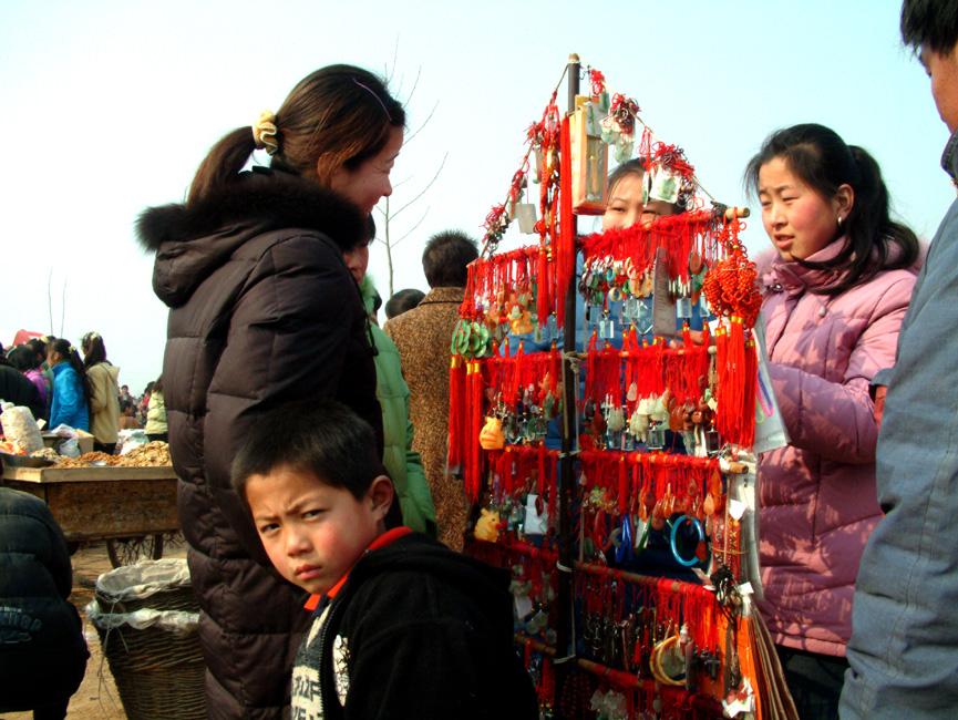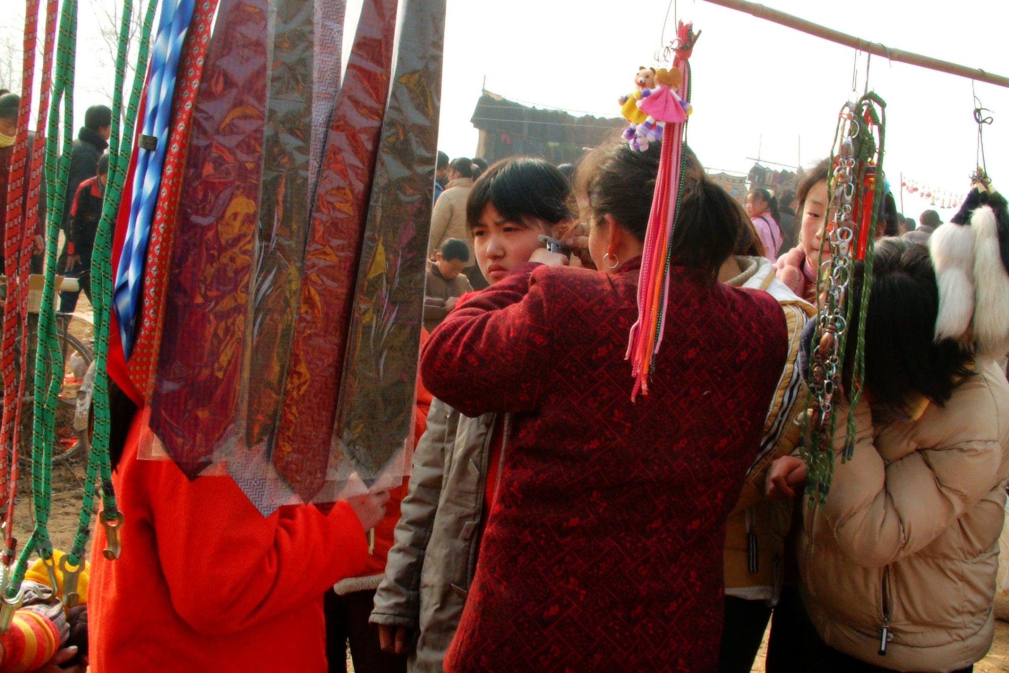 在庙会的上的另一个摊位前,两个女孩在购买手链、项链、头绳等物品。摄影师看到,女孩们挑选起东西来,也是很认真,先拿起来在手上比划一下大小,再看一下颜色和图案,唯独对价格好像没有什么概念,卖东西的大姐说多少钱,她们就给多少钱,然后付完钱拿着就戴上了。