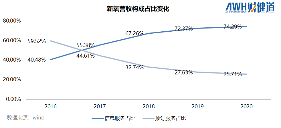 2020年,新氧信息服务收入达9.62亿,预定服务收入为3.33亿,同比分别增长了15.4%和 4.6%。在总营收中,信息服务收入占比约75%;从2016年起,这一比例不断增加。据此可以认为:新氧的盈利从以电商模式为主转向以广告商模式为主。