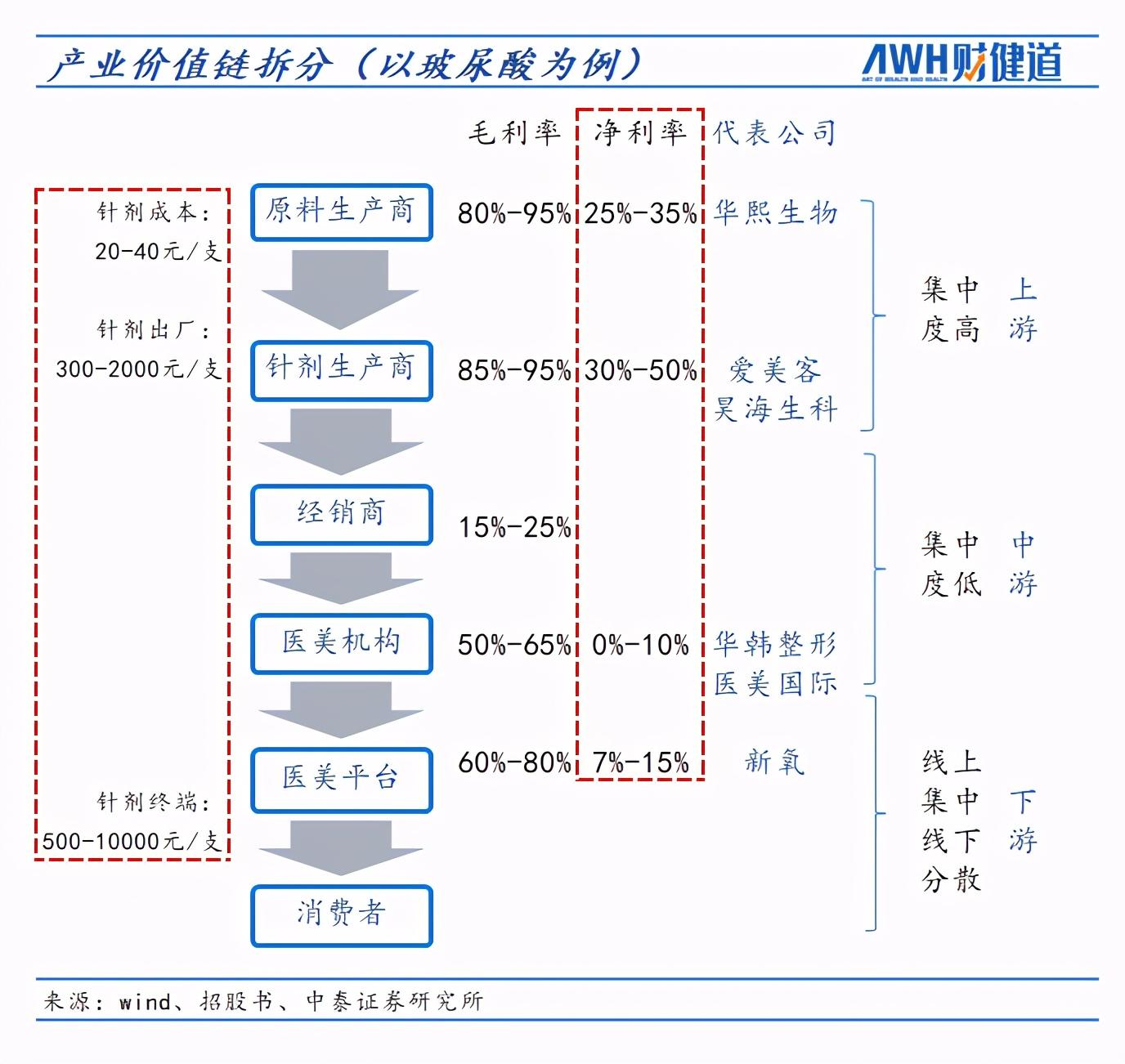 一针30元成本的玻尿酸,注入爱美女生的体内时,终端价格变成了500—10000元。