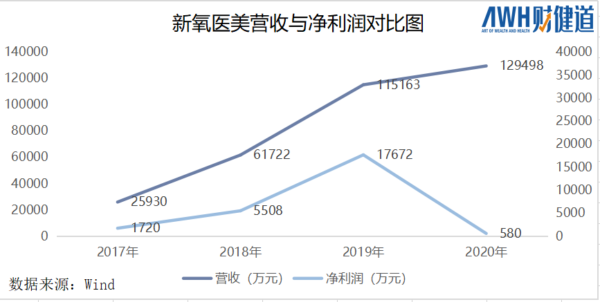 从新氧营收与净利润对比图可以看出,2017-2019年,两者同步上扬,但在2020年却呈现出完全不同的走势。