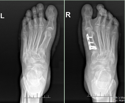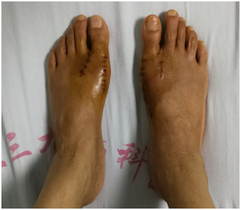 完善相关检查后,柴亚胜为患者实施了“左脚第一跖骨头截骨、踇外翻矫形术和右脚第一跖骨截骨矫形内固定、踇外翻矫形术”。术中,患者左右脚的踇外翻得到有效纠正,术后疼痛症状减轻,术后一周便可以穿减压鞋下床走路。