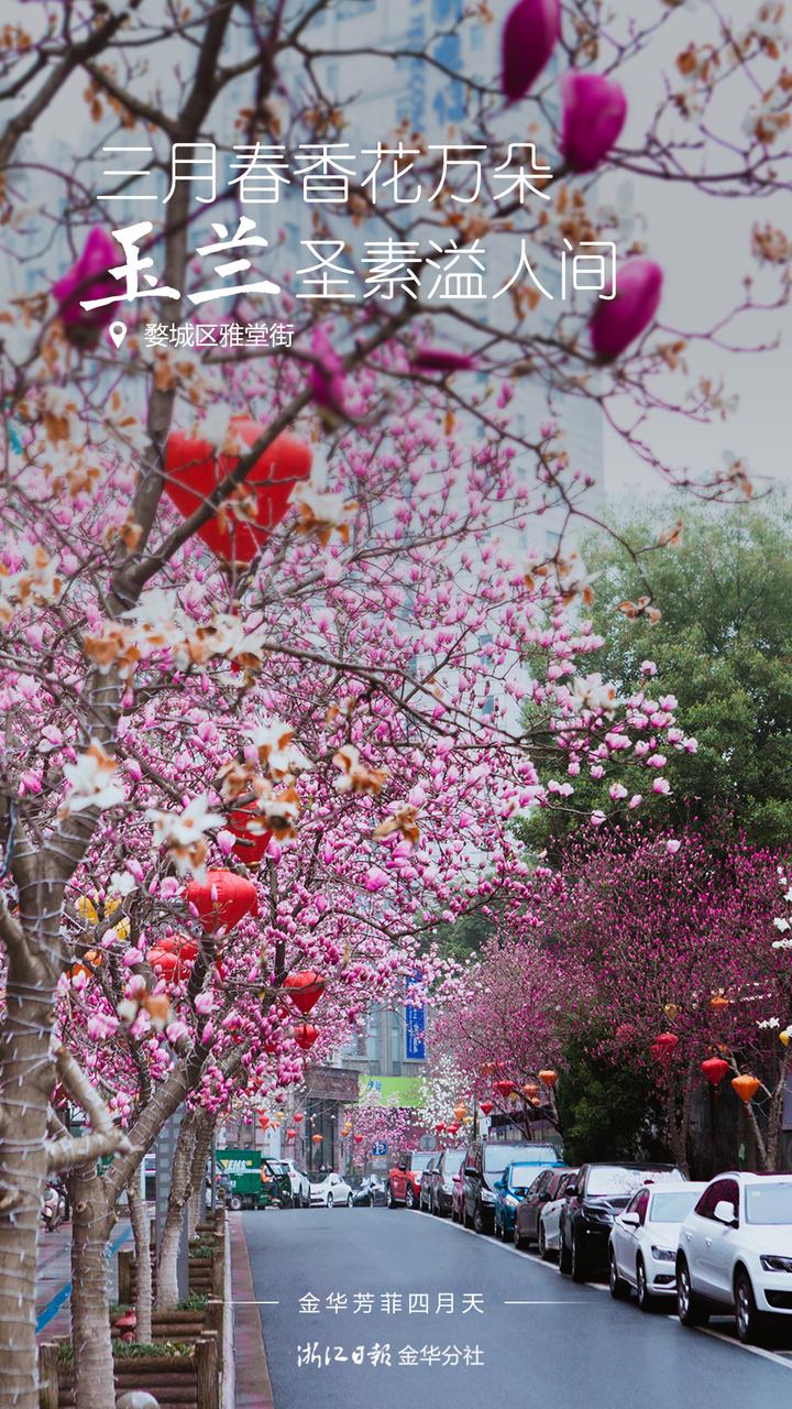 玉兰花每年春季盛开,漫步在金华市区的雅堂街,淡淡的玉兰香气扑面而来,绯紫的玉兰花把整条街装点得格外美丽,让人心旷神怡。