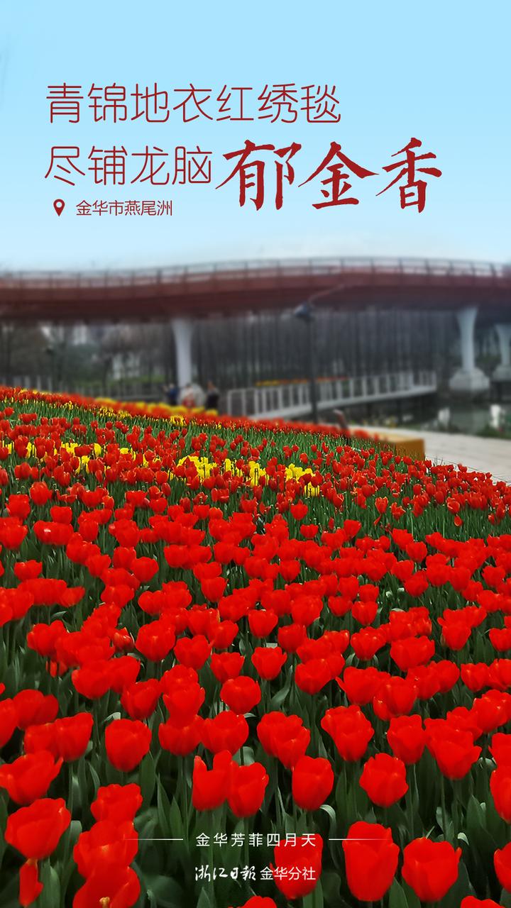 亭亭玉立的郁金香,和彩虹桥交相辉映,把燕尾洲公园装扮得格外动人,红白黄交织成画,铺满一地。婺江边,轻风徐徐吹来郁金花香,“醉”了路人。