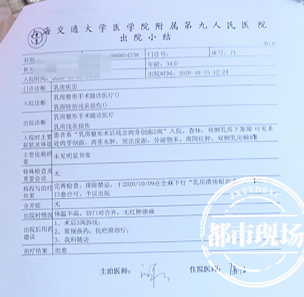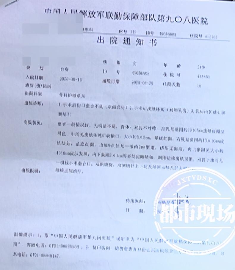 中国人民解放军联勤保障部队第908医院的出院诊断显示,王女士双侧乳房手术后伤口愈合不良,术后皮肤坏死,住院16天。王女士说,因调节后伤口仍未痊愈,之后,星妍美容医院又安排她转院去了上海继续调节。