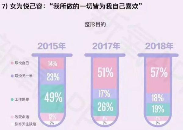 此外,在统计其他整容原因上,上述医美行业调查报告的数据显示,超半数女性选择整容是为了取悦自己;其次是出于工作需要,占比为19%。