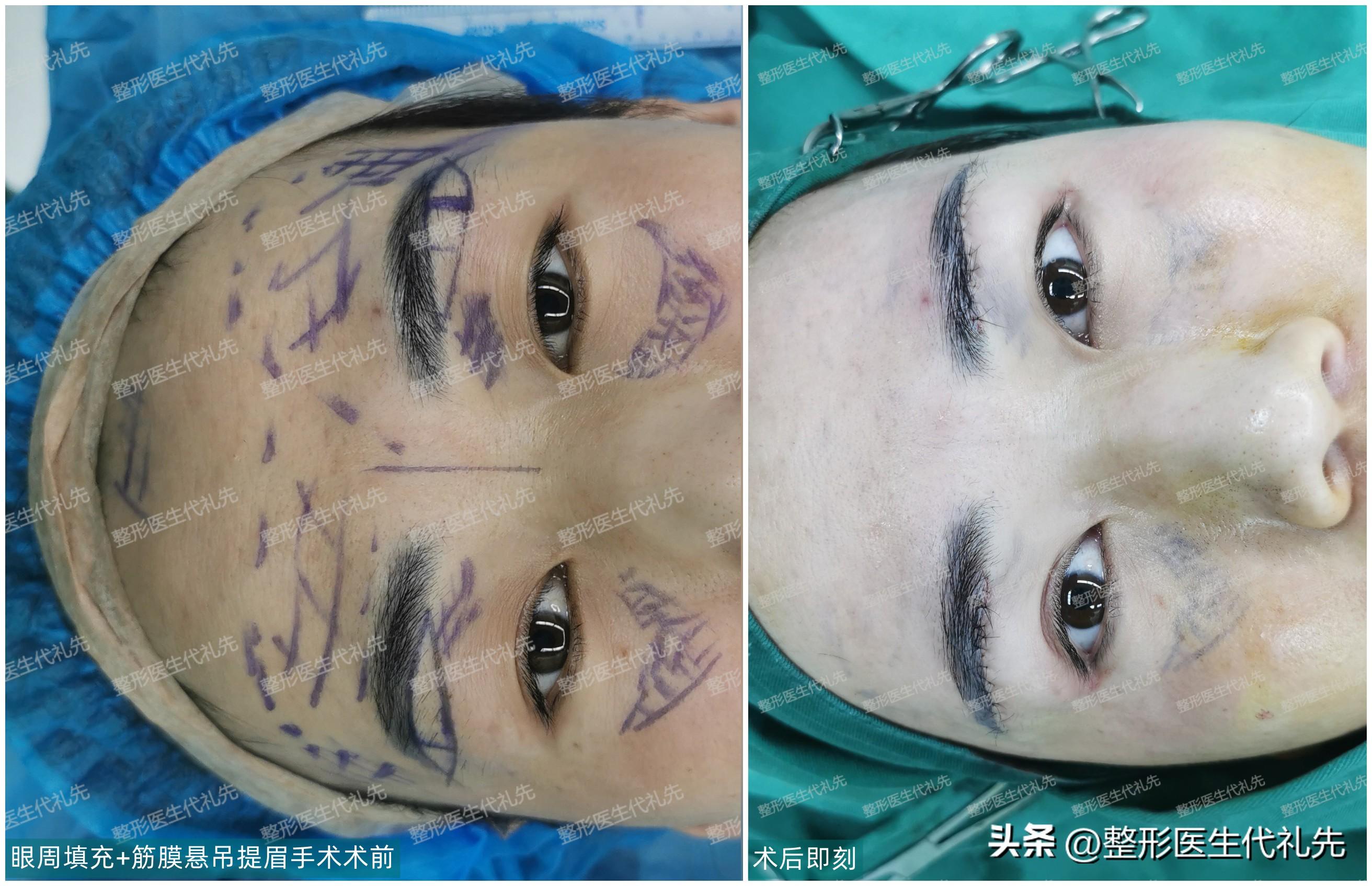 女士眼周凹陷填充+筋膜悬吊提眉手术,术前术后对比。