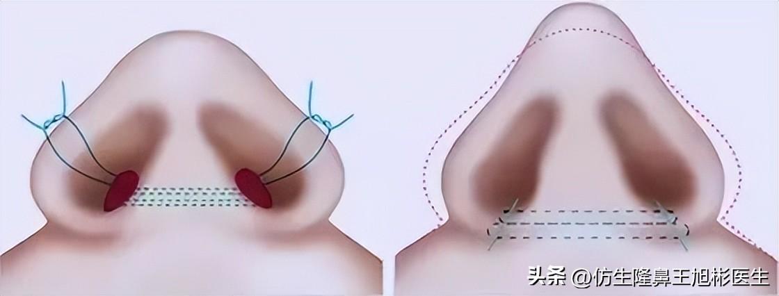 2.鼻头软骨内收手术缝合术:选用鼻中隔软骨横切面口或"V"创口,显出两边鼻头软骨,将鼻头软骨内收手术缝合。