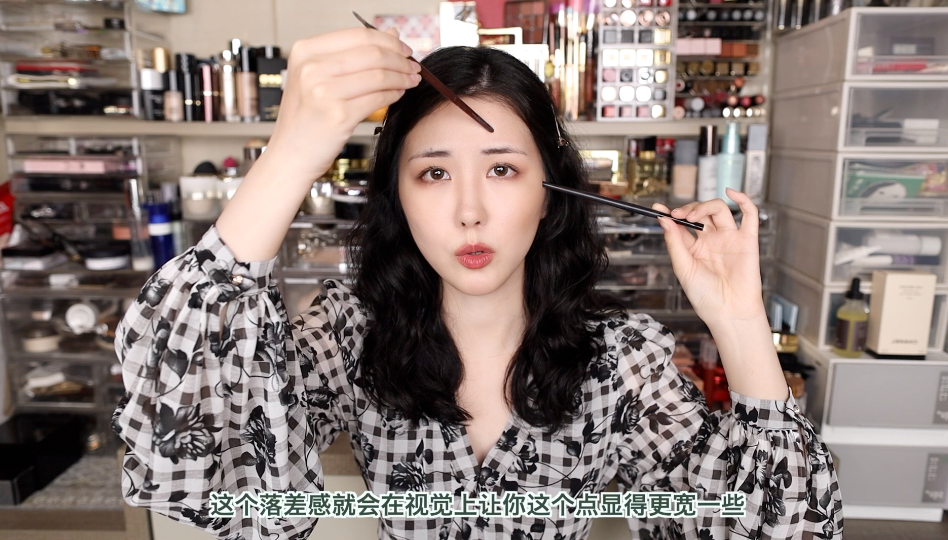 视觉拓宽额头转折角颧弓外扩是对比出来的。刚刚讲过太阳穴就是一个对比点,另一个对比点就是额头的转折角。