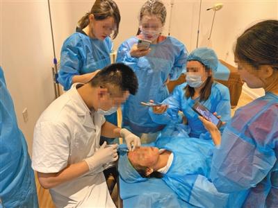 6月27日,天津美致医疗美容诊所,新京报记者所在的微整形速成班培训期间,老师(穿白衣者)为学员现场做微整形注射项目,其余学员在一旁观摩学习。