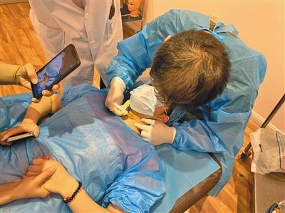 学员中有一位21岁的女生,每一次练习,都面色凝重。练习抽血时,她在同伴胳膊上进针多次才找到血管,抽完血直接把针拔了,忘了止血。一股血流顺着胳膊淌出来,现场又是一阵惊慌。