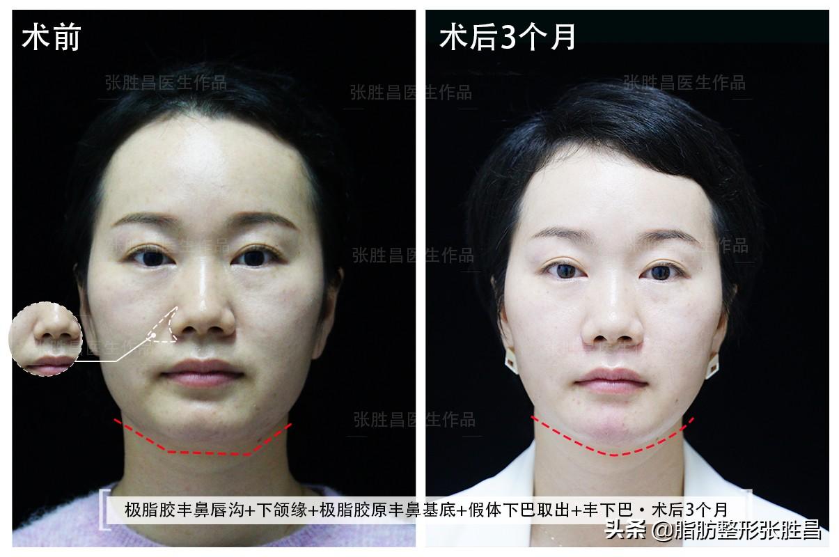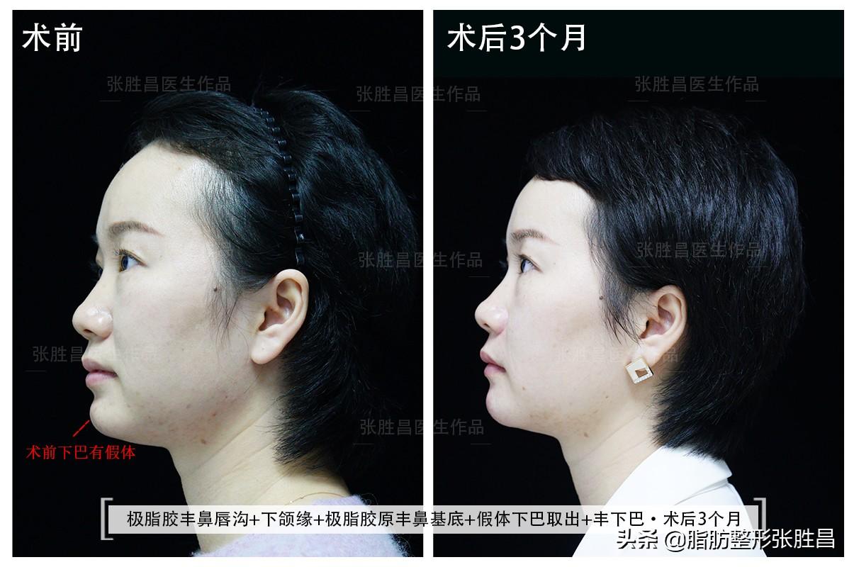 而且下颌缘衔接也没有兼顾上,与面部断层,侧面显短,仍有后缩感,经面诊沟通,后制定的手术方案为:极脂胶丰鼻唇沟+下颌缘+假体下巴取出+极脂胶原丰下巴+鼻基底。
