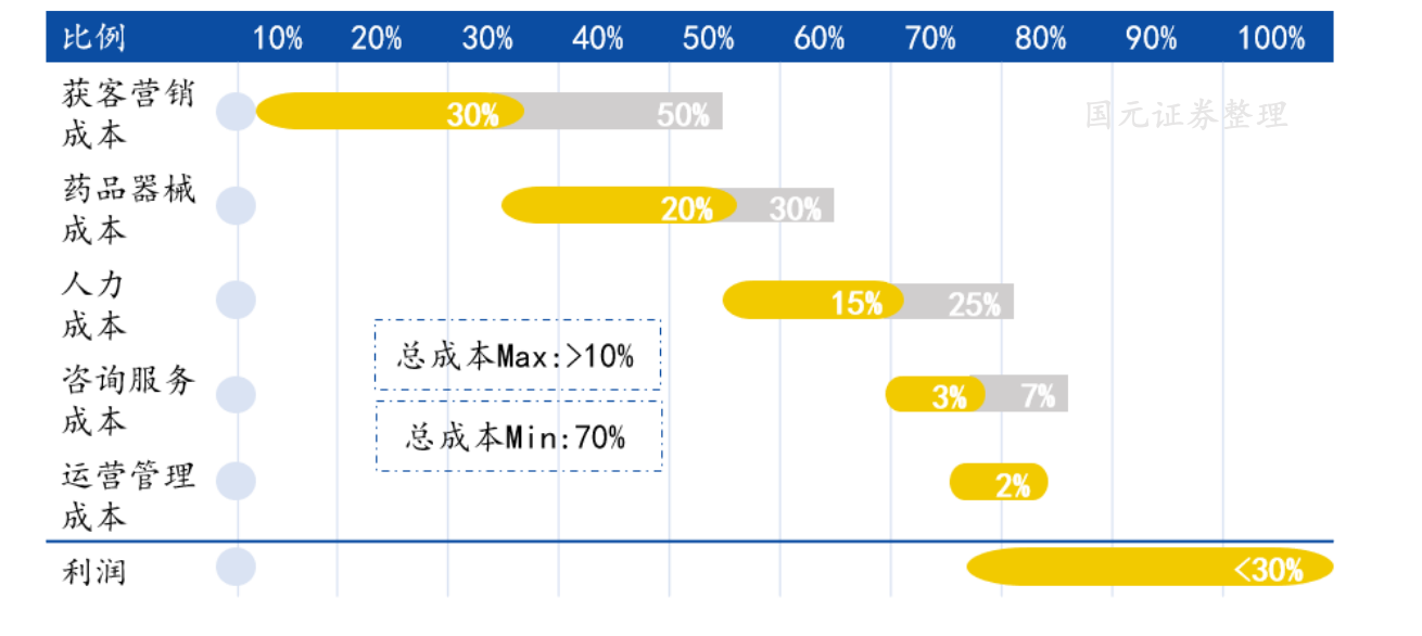 传统医美机构获客营销成本为30%-50%,药品器械成本占20%-30%,人力成本(主要为医生成本)15-25%,咨询服务成本3-7%,除以上成本外,还包含运营管理成本等。