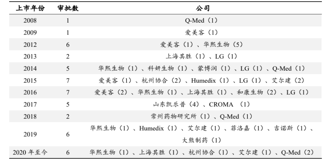 2008至今,NMPA(药品监督管理局)共批准了6个、17家厂商的48款III级医疗器械玻尿酸注射产品。其中,已批准9家中国厂商的29款产品,批准8家国外厂商的19款产品,近五年年均准入玻尿酸注射产品数量在5个左右。