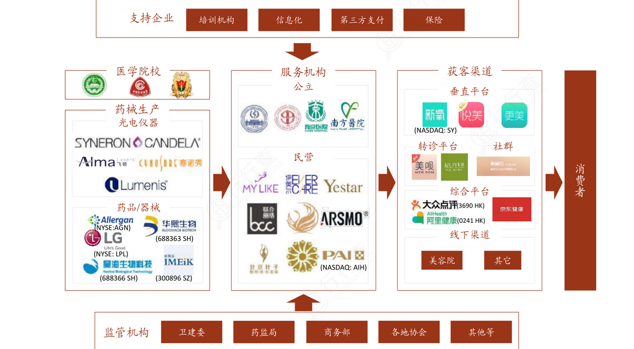 医疗美容产业链医疗美容产业链可以分为三个部分:上游-原料生产商、产品/设备制造商、中游-医美机构、下游医疗美容营销平台。