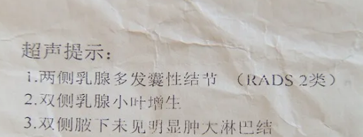 近曲阳医院报告则说,两侧乳腺多发囊性结节。而杭州中医院核磁共振的结论中写明,双乳内散在多发小结节状T2WI低信号影,钙化可能。红房子医院的结论则为,乳腺纤维囊性增生。